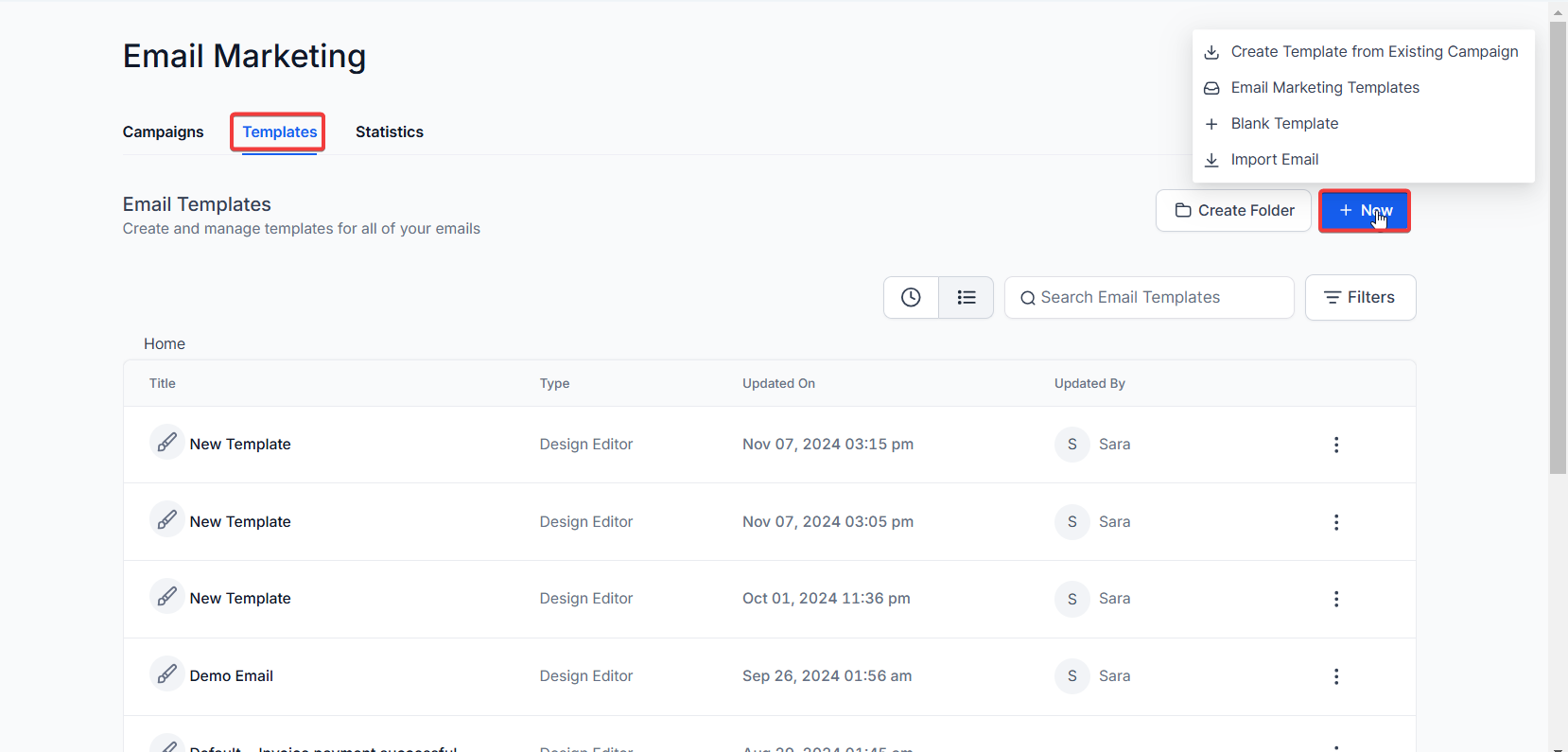 • Start by creating a new campaign using the pre-built templates available in your account in Marketing>emails>campaigns
